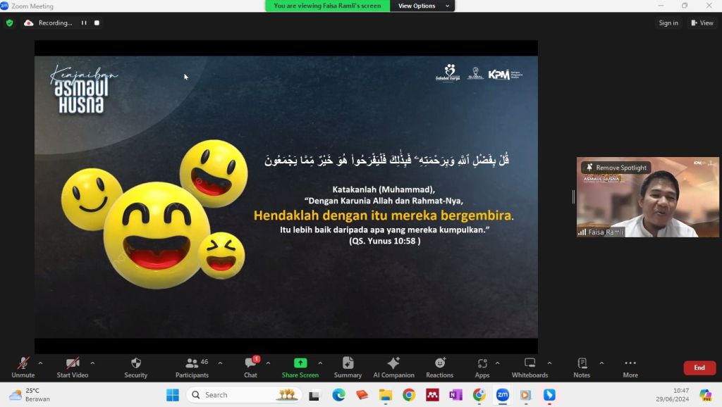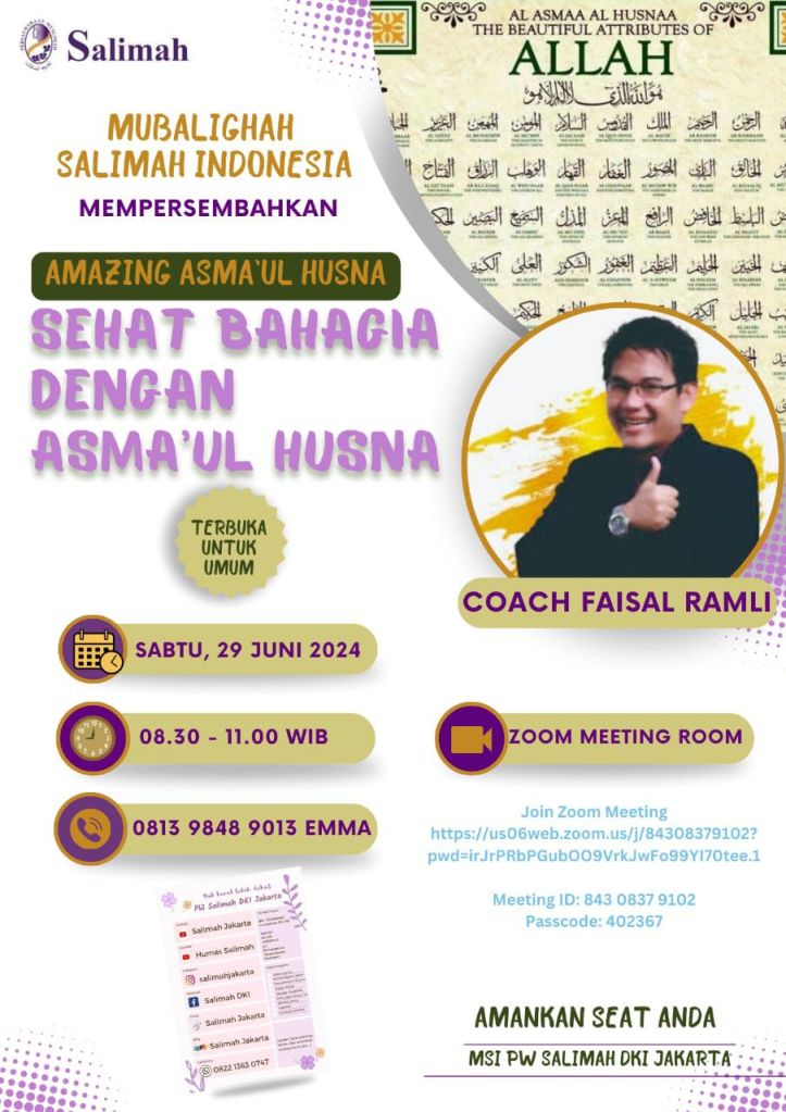 UJIANKU JALAN SURGAKU “Sehat dulu atau bahagia dulu?” “Disayang suami baru bahagia atau bahagia dulu baru disayang suami?” “Bahagia dulu baru hutang lunas atau lunas hutang dulu baru bahagia?”Demikian pertanyaan yang disampaikan narasumber, coach Faisal Ramli, di awal materi pada webinar Sehat Bahagia dengan Asma’ul Husna. Acara yang juga merupakan soft launching Mubalighah Salimah Indonesia (MSI) Pimpinan Wilayah Persaudaraan Muslimah (PW Salimah) DKI Jakarta ini berlangsung interaktif sesuai keinginan coach agar peserta lebih bisa memahami dan memiliki niat yang kuat untuk mempraktikkan materi.Faisal menjelaskan mengapa kita harus bahagia dulu. Sebab, seperti itulah yang Allaah perintahkan di QS. Yunus 58 yang artinya “Katakanlah (Muhammad), dengan karunia Allaah dan rahmatNya, hendaklah dengan itu mereka bergembira. Itu lebih baik daripada apa yang mereka kumpulkan.”“Ketika ada masalah, jangan terlalu lama fokus pada masalahnya, tapi fokus perbaiki hubungannya. Fokus kepada yang memberi masalah, yaitu Allaah SWT. Diri kita, perilaku kita atau orang lain, situasi yang kita hadapi, adalah perantara untuk datangnya masalah. Innalillahi wainnailaihi roji’un, semuanya datang dari Allaah dan kembali kepada Allaah,” jelasnya.Selain dengan Allaah, perbaiki hubungan dengan orangtua, pasangan, dan orang-orang di sekitar. Jadi, tidak hanya fokus pada inti masalah.“Kenapa sih kita sulit bahagia? Coba simak 3 ENG ini : NGeribetin hidup sendiri (misalnya sudah punya makanan, tapi menginginkan makanan yang lebih enak). NGgak terima takdir (percaya akan takdir Allaah tapi sulit menerimanya). Dan NGambil urusan Allaah (misalnya memaksakan anak sesuai keinginan kita). Kita harus tahu batasan, mana yang menjadi wilayah wewenang Allaah,” terang Faisal.Ia juga berpesan, ketika bermasalah dengan suami, jangan hanya berdoa agar Allaah mengubah suami saja. Tetapi berdoa jugal agar Allah mengubah diri dan melembutkan hati kita. Bisa jadi energi negatif dari diri kita yang menjadi pantulan dari orang lain yang kembali kepada kita.“Makna kebahagiaan, menurut imam Al Ghazali, adalah orang yang bisa membuka hatinya, telah membuka hijabnya terhadap Allaah, sehingga ia merasa dirinya dikendalikan oleh Allaah di manapun dan kapanpun. Mantapkan dalam hati kita: Ujianku Jalan Surgaku! Walau masalah belum selesai, putuskan untuk bahagia detik ini juga! Jangan pernah merasa sendirian, ingat ada Allaah yang senantiasa menemani,” pesannya.(ED-Humas PW Salimah DKI Jakarta)